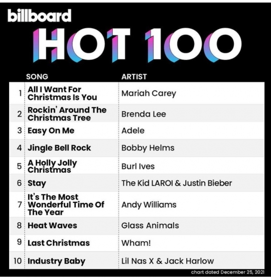 빌보드는 21일(한국 시각) 공식 트위터를 통해 "머라이어 캐리의 'All I Want for Christmas Is You'가 2021년 12월 25일 자 빌보드 핫100 차트 1위에 올랐다"라고 밝혔다.