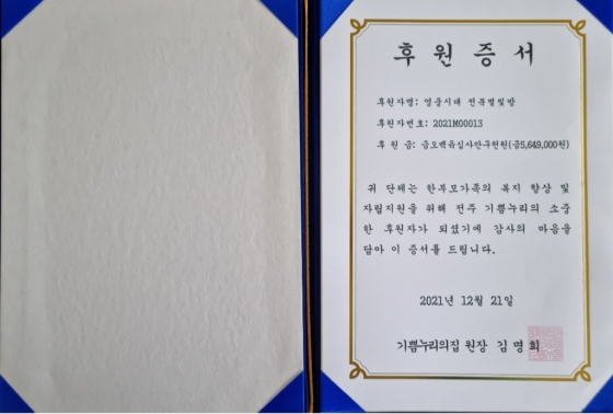 김명희 기쁨누리의집 원장은 "두 번째 후원금 역시 엄마들의 자립을 위한 프로그램 운영에 가치 있게 사용하겠다"며 "임영웅을 사랑하는 마음만큼 의미 있는 기부활동에 나선 영웅시대 전북별빛방 회원들의 선한 영향력이 사회의 따뜻한 빛이 되기를 바란다"고 말했다.