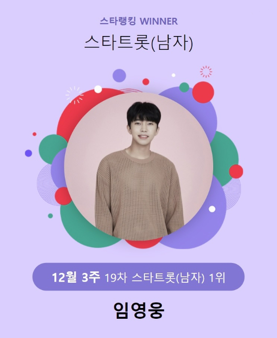 임영웅은 지난 12월 16일 오후 3시 1분부터 12월 23일 오후 3시까지 진행된 스타트롯 남자 랭킹 12월 3주(19차) 투표에서 23만6452표를 얻어 1위에 올랐다. 이는 19주 연속 1위다.