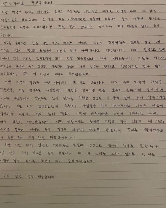 제가 우리 사회에 해악을 끼친만큼, 저를 믿어주는 사람들에게 실망을 안겨드린 만큼 앞으로 올바르게 살아가며 다시는 누군가에게 상처주는 일이 없도록 노력할 것임을 이 글을 빌어 굳게 약속드리겠습니다.