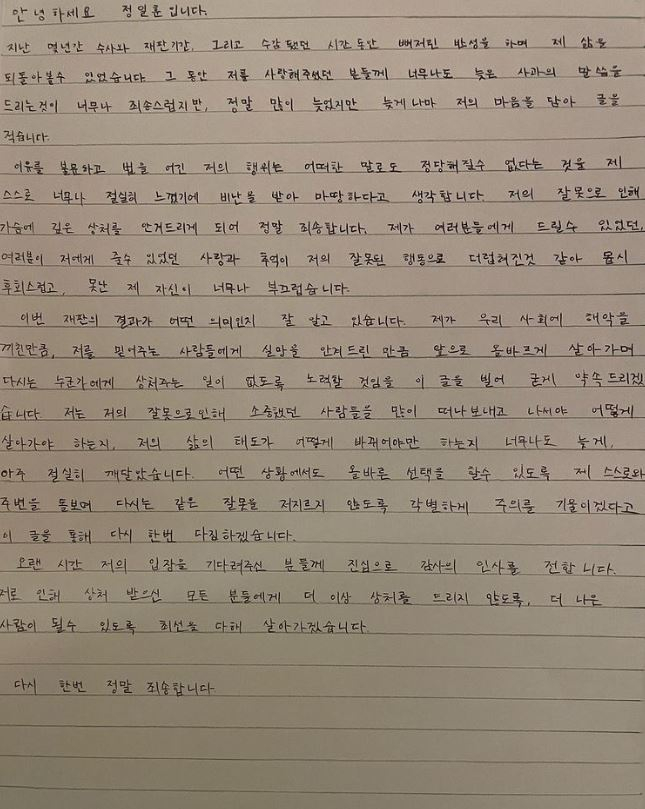 정일훈은 "지난 몇 년간 수사와 재판 기간, 그리고 수감됐던 시간 동안 뼈저린 반성을 하며 제 삶을 되돌아볼 수 있었다"라며 "그동안 저를 사랑해주셨던 분들께 너무나도 늦은 사과의 말씀을 드리는 것이 너무나 죄송스럽지만, 정말 많이 늦었지만 늦게나마 저의 마음을 담아 글을 적는다"라고 운을 뗐다.