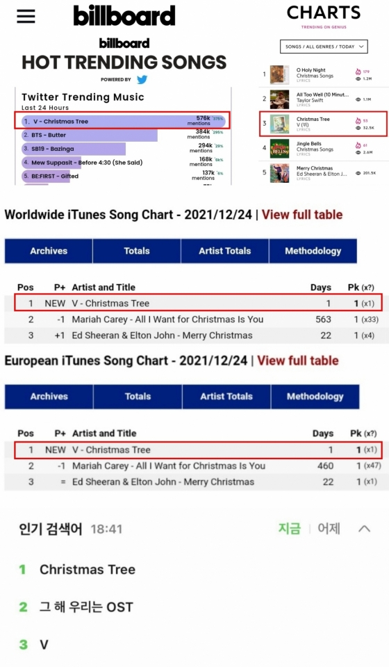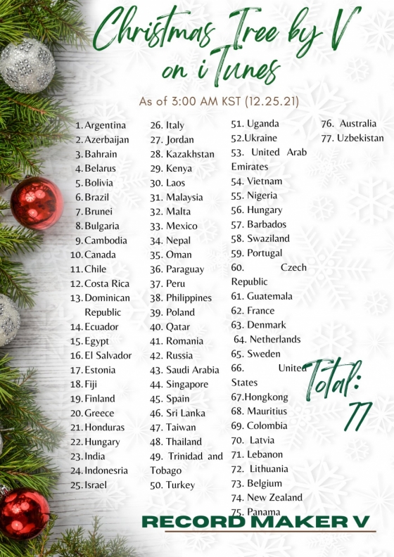 특히 미국은 'Christmas Tree' 'Christmas Tree(Inst.)'가 크리스마스 레전드 캐롤송 머라이어 캐리의 'All I Want For Christmas Is You'을 제치고 나란히 1,2위를 차지해 놀라움을 안겼다. 뷔는 K팝 솔로 가수 최초로 미국 아이튠즈 1위와 2위에 동시에 진입한 기록을 더하며 'RECORD MAKER V'의 명성을 재확인했다.