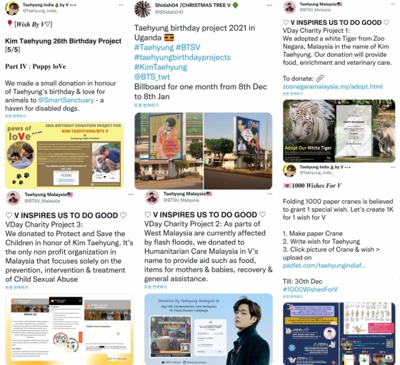 뷔의 팬들은 전 세계 곳곳에 떨어져 있지만 뷔를 사랑하는 마음으로 하나가 되어 기부, 즐기는 이벤트, 서포트 등으로 뷔의 생일을 축하하며 축제 분위기를 달구고 있어 흐뭇함을 안긴다.