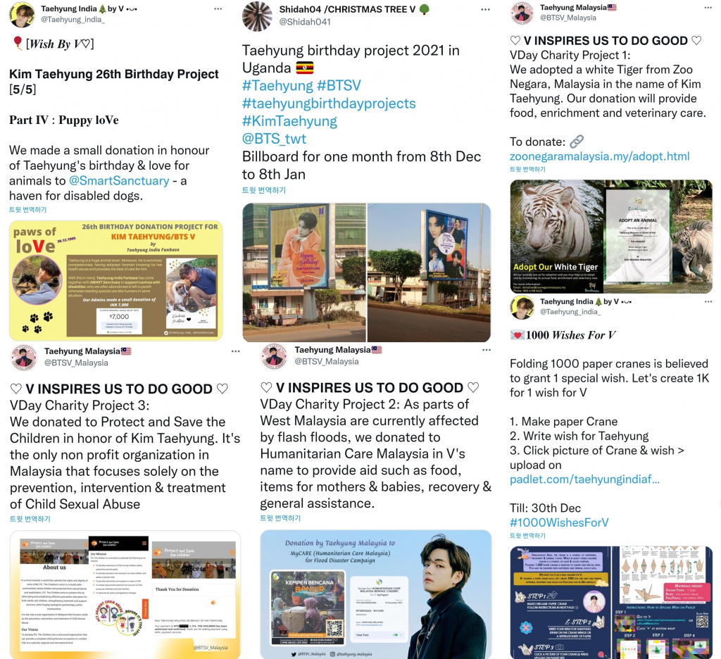 말레이시아 팬베이스 'Taehyung Malaysia'는 김태형의 이름으로 도움이 필요한 백호 한 마리를 입양해 음식을 먹이고 수의학 치료를 제공할 것이라 전했다.