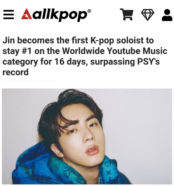 미국 매체 올케이팝(Allkpop)은 "진이 싸이의 기록을 뛰어넘어 16일동안 전 세계 유튜브 음악 부문에서 1위를 한 최초의 K팝 솔로 가수가 되다'라는 기사를 통해 소식을 전했다.