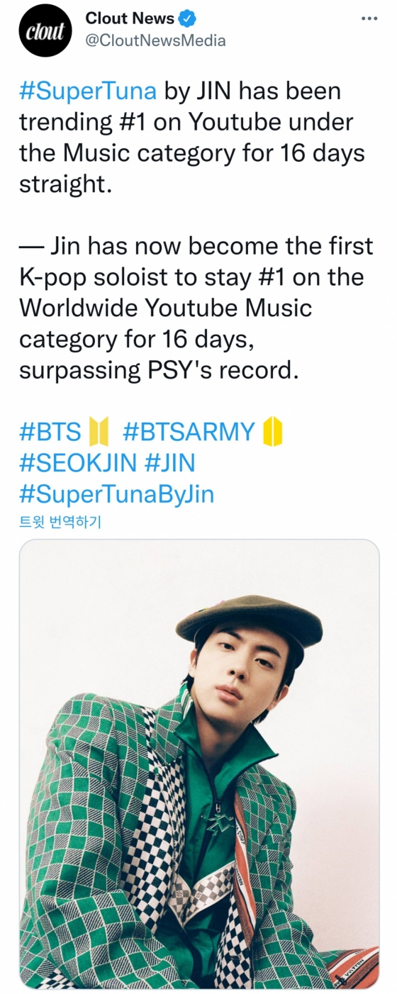 미국의 'Clout News'와 'KpopStarz' 등의 매체들도 진이 16일동안 전 세계 유튜브 음악 부문에서 1위를 하며 싸이의 기록을 뛰어넘어 최초의 K팝 솔로 아티스트가 된 소식을 전했다.