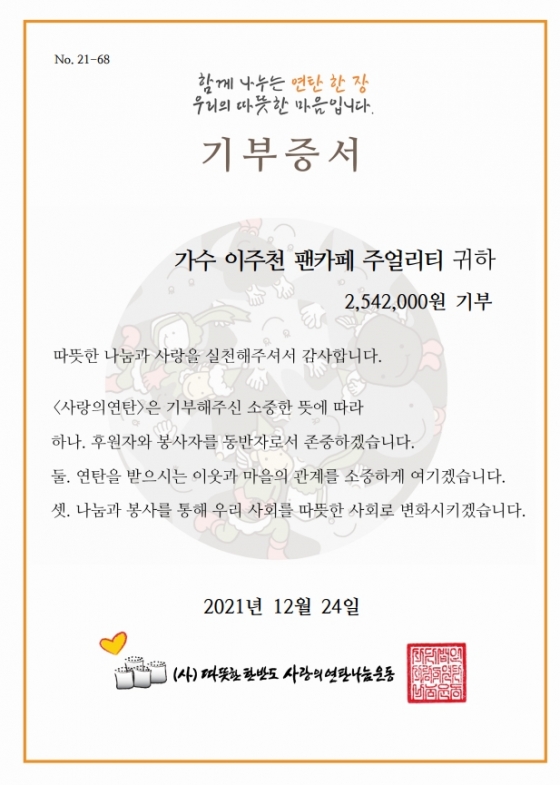 이주천 팬클럽 'JU-ALITY'는 12월 24일 사단법인 따뜻한 한반도 사랑의 연탄 나눔 운동(이사장 이동섭)에 254만 2000원을 기부했다.