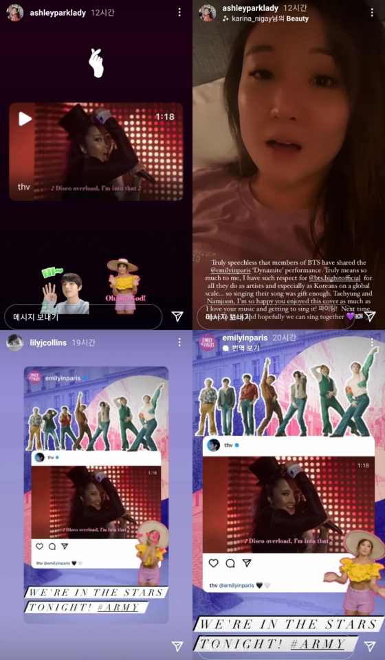 뷔가 'Dynamite'를 부르는 장면을 게재하자 드라마 '에밀리, 파리에 가다'의 공식 인스타그램은 이를 리그램하며 홍보에 나섰다. 애슐리 역시 뷔의 릴스를 리그램하면서 손가락하트와 뷔의 사진과 '오 마이 갓'을 외치는 본인의 사진을 첨부해 기쁜 마음을 전했다. 또한 "세계적인 아티스트이자 한국인으로서 방탄소년단이 해낸 모든 업적을 존경한다. 너무 행복해 다음에 함께 노래를 할 기회가 생기길 기대해"라고 감동의 말을 덧붙였다.