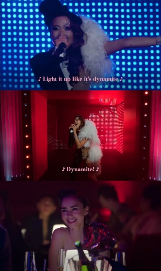 뷔는 지난 28일 자신의 인스타그램을 통해 '에밀리, 파리에 가다'에서 애슐리 박(Ashley Park)이 클럽에서 방탄소년단이 지난 2020년 발표한 히트곡 'Dynamite'를 열창하는 영상을 게재했다. 뷔는 'emilyinparis'를 태그하고 애슐리의 의상을 따라 흑백 하트를 표기해 이 영상을 얼마나 좋아하는지 표현했다.
