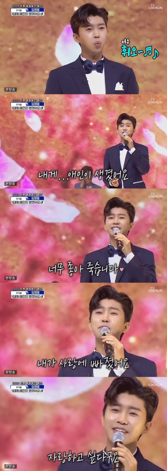 휘파람을 불며 여유롭게 무대를 시작한 임영웅은 실제 애인이 생긴 것처럼 달달한 모습의 밝은 표정으로 무대를 달콤하게 물들였다.