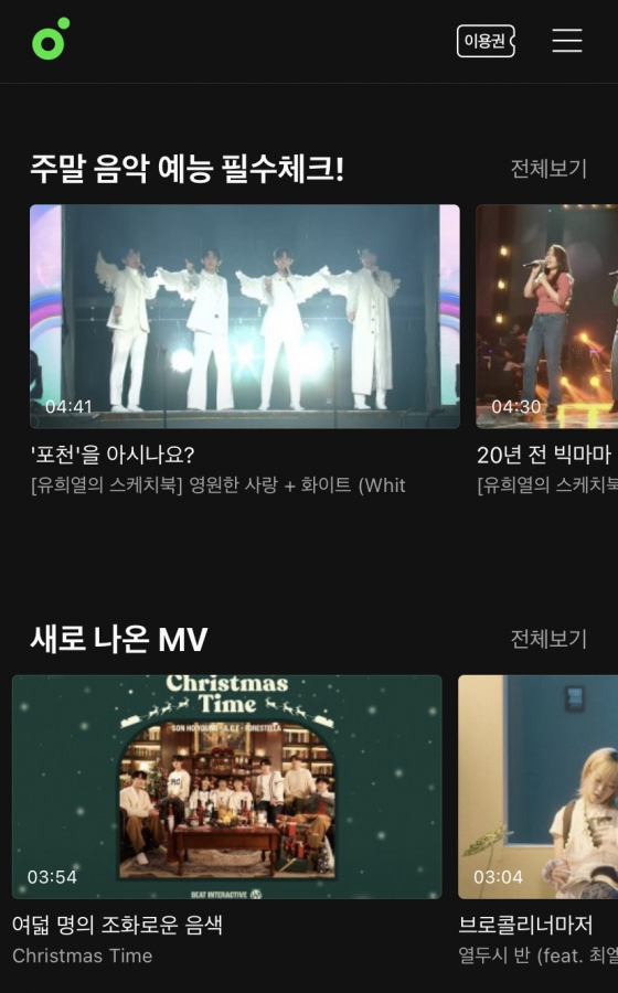 또한, 멜론 앱의 메인화면인 뮤직탭에서는 '주말 음악 예능 필수체크!', '어제 많이 본 MV'(뮤직비디오)와 같은 타이틀을 통해 최근 트렌디한 영상콘텐츠를 이용자에게 추천하고 있기도 하다.