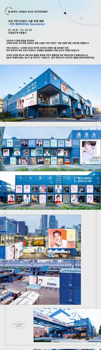 지민의 27세 생일 축하로 진행된 건대 입구역 '커먼그라운드'의 전체 외벽 래핑 행사는 1일 대여료만 약 1000만 원에 달할 만큼 대규모로, 1600평 규모의 부지에 200개의 컨테이너를 쌓아올려 만든 국내 최대 컨테이너 팝업 쇼핑몰이자 젊은층의 핫플레이스에서 진행됐다.