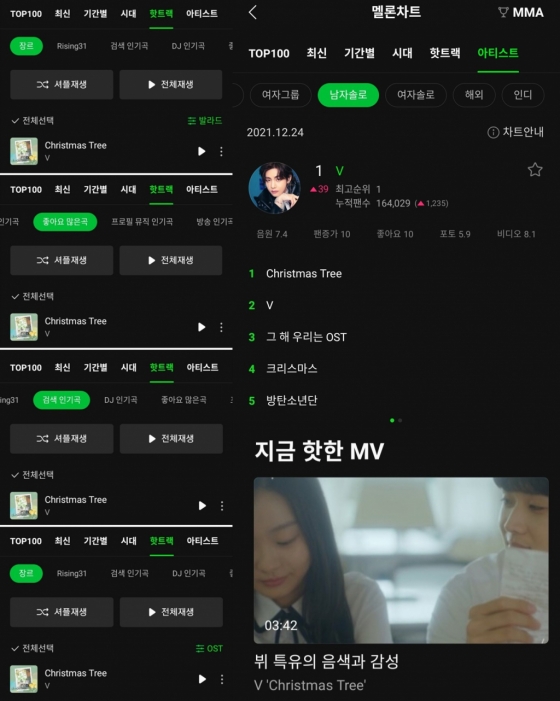 뷔의 '크리스마스 트리'는 멜론 이용자 수의 꾸준한 증가로 최단 기간인 발매 6일 만에 일간 최고 이용자 수 12만 6381명을 기록하며 남자 그룹의 멤버 중 최고 순위에 올랐다. 일간 최고 이용자 수 10만 명을 돌파한 남자 그룹의 멤버는 뷔와 위너(WINNER)의 송민호(MINO) 뿐이다.
