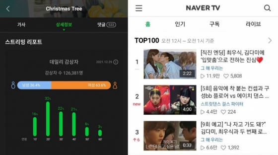 포털 사이트 네이버 연예의 '사람들이 많이 찾아본 음악'에도 '크리스마스 트리'가 1위에 올라 화제의 중심에 있음을 입증했다. 이 차트는 전일 오후 2시부터 24시간 동안 VIBE와 네이버 앱에서의 음악 검색 횟수를 집게한 것으로, 음악 팬들뿐 아니라 드라마 속 뷔의 노래를 검색하는 시청자들까지 폭발적인 관심을 나타내고 있다.
