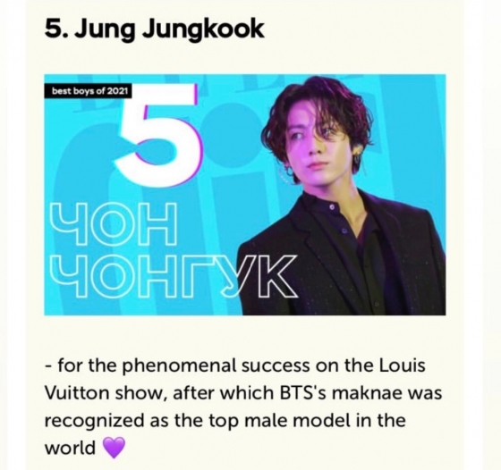 이에 엘르걸 러시아는 "루이 비통 쇼에서 경이적인 성공을 거두었고, 그 후 세계 최고의 남자 모델로 인정받았다"라며 세계적인 명품 브랜드 루이 비통의 2021 F/W 맨즈 컬렉션 쇼에서 맹활약을 펼친 정국을 호평하며 극찬했다.