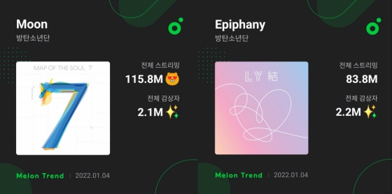 진의 솔로곡들은 2021년 멜론에서 'Epiphany'(에피파니), 'Awake'(어웨이크), 'Moon'(문)만을 포함, 1320만회 이상의 스트리밍을 돌파했다.