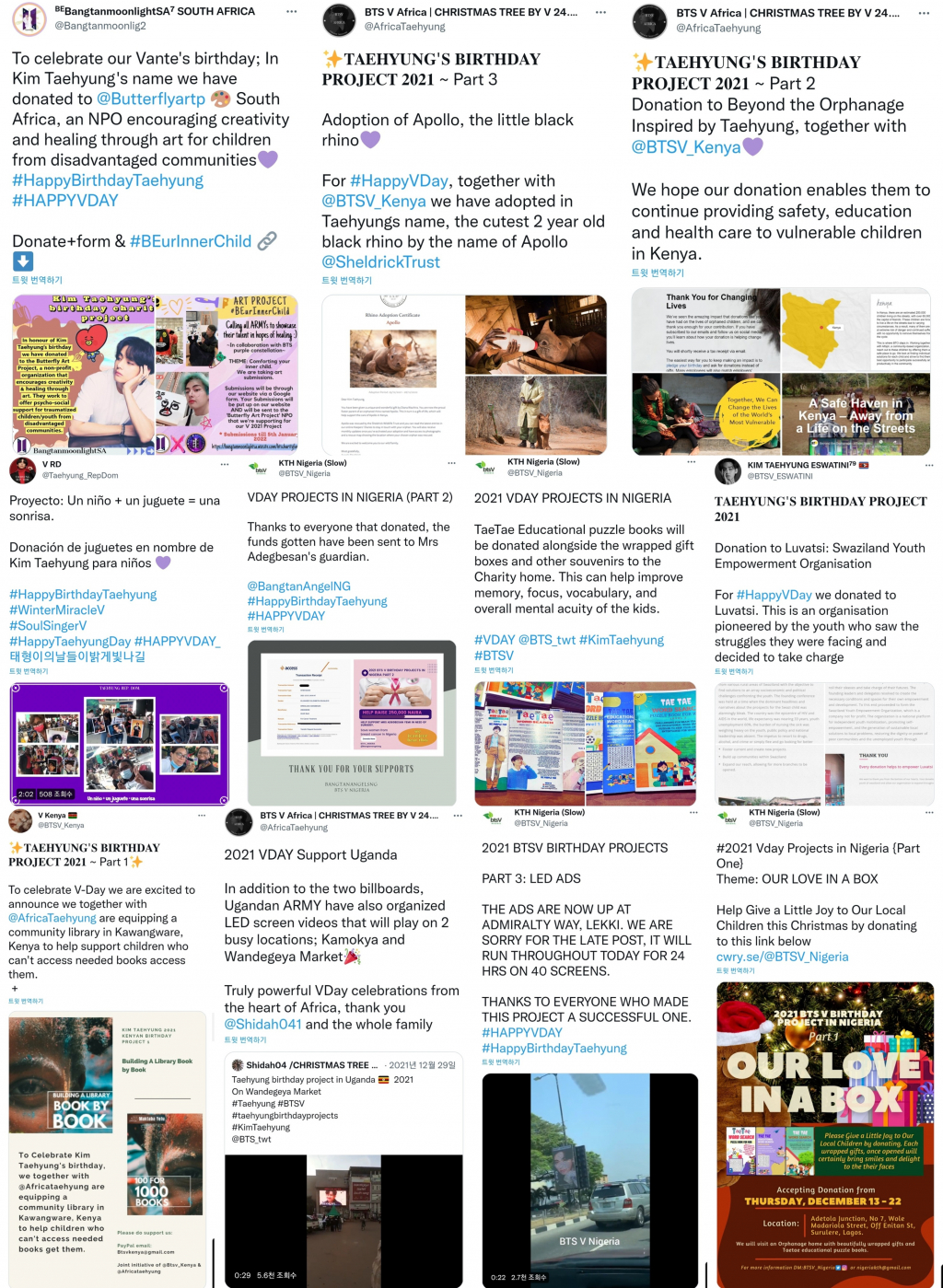 아프리카 팬베이스 'BTS V Africa'는 아이들을 사랑하는 뷔로부터 영감을 받아 "케냐의 취약한 어린이들에게 안전, 교육, 건강관리를 계속 제공할 수 있기를 바란다"고 전하며 케냐 팬베이스 'BTSV_Kenya'와 함께 'BEYOND THE ORPHANAGE'에 기부했다.