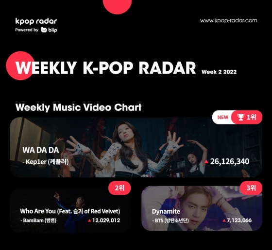 신인 걸그룹 케플러(Kep1er)가 데뷔곡 'WA DA DA'로 케이팝 레이더 뮤직비디오 주간 차트 1위에 올랐다.