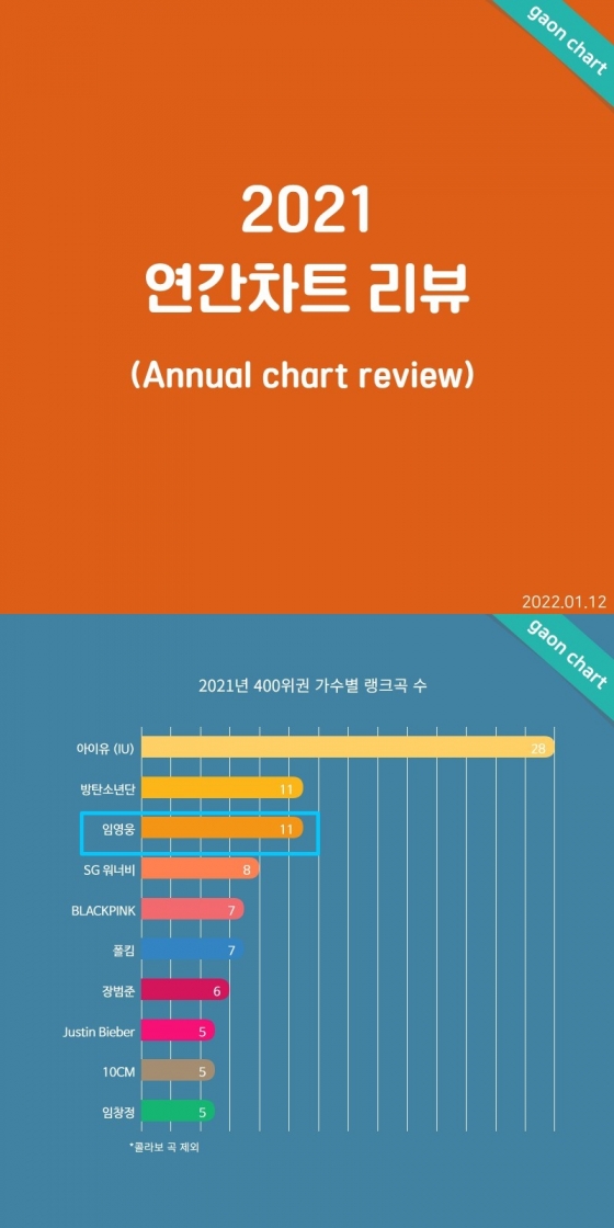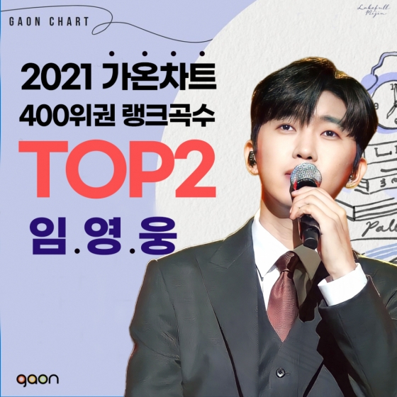 가온차트 2021 연간차트 리뷰(Annual chart review)에 따르면 2021년 400위권 가수별 랭크곡 수에서 임영웅은 11곡을 기록, 2위를 차지했다.