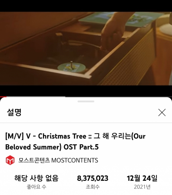 방탄소년단(BTS) 뷔가 참여한 SBS 월화극 '그 해 우리는' OST 'Christmas Tree(크리스마스 트리)' 뮤직비디오가 유튜브에서 800만 뷰를 돌파하며 글로벌 인기를 빛냈다.