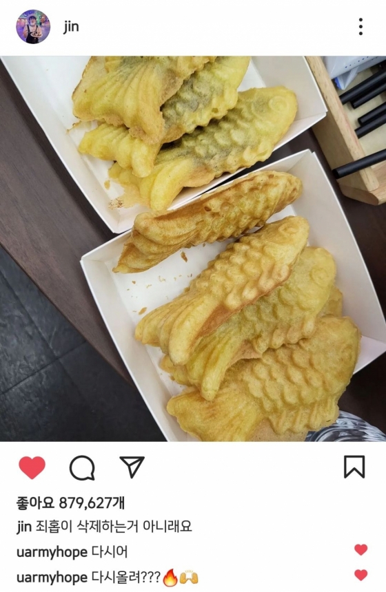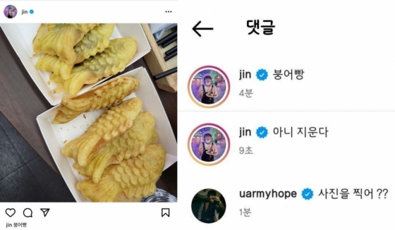 그 후 진은 '죄홉이 삭제하는거 아니래요'라는 글과 함께 붕어빵 사진을 다시 인스타그램에 올리기도 했다.