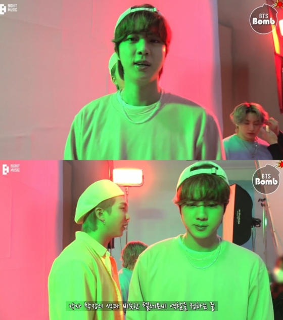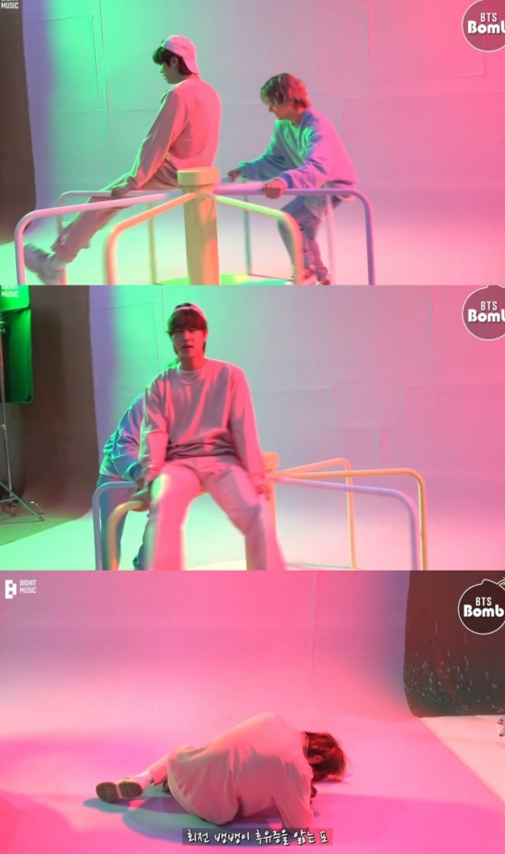 '텔레토비'로 자기소개 후 멤버 정국과 촬영 소품인 회전 뱅뱅이를 빠르게 타다 어지러웠던 진은 바닥으로 내려 카메라에 등을 보이며 옆으로 쓰러져 있는 귀여운 모습을 보여줬다.
