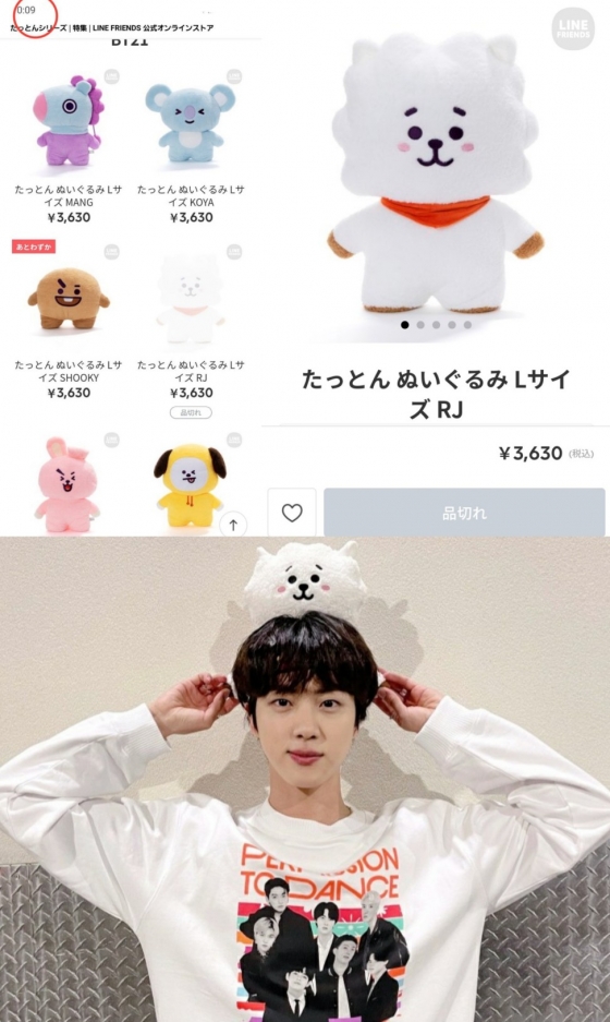 방탄소년단(BTS) 진의 BT21 캐릭터 'RJ'(알제이)가 품절을 이어가며 슈퍼 파워 인기를 뽐냈다.
