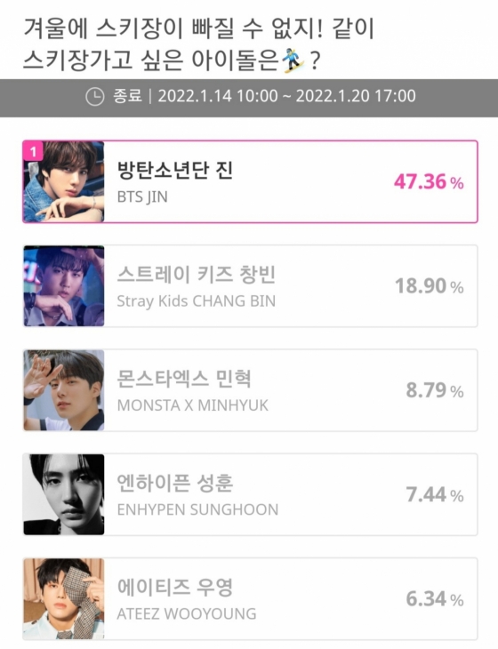 방탄소년단(BTS) 진이 '같이 스키장 가고 싶은 아이돌' 1위에 오르며 뜨거운 인기를 입증했다.
