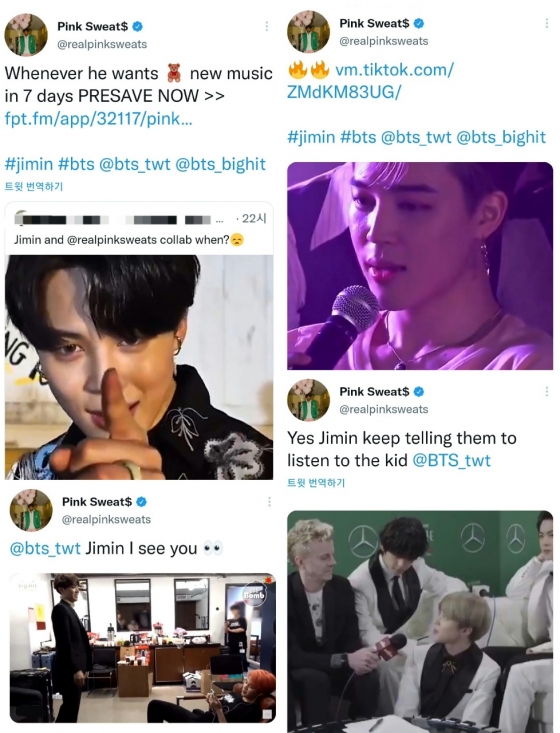 방탄소년단(BTS) 지민이 유명 알앤비(R&B) 가수 핑크 스웨츠(Pink Sweat$)로부터 러브콜을 받아 화제다.
