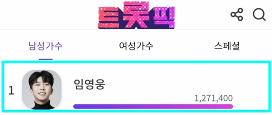 임영웅은 트로트 스타 웹서비스 트롯픽(Trotpick)에서 1월 17일부터 1월 23일까지 진행된 위클리 투표에서 127만 1400표로 압도적 1위를 차지했다.