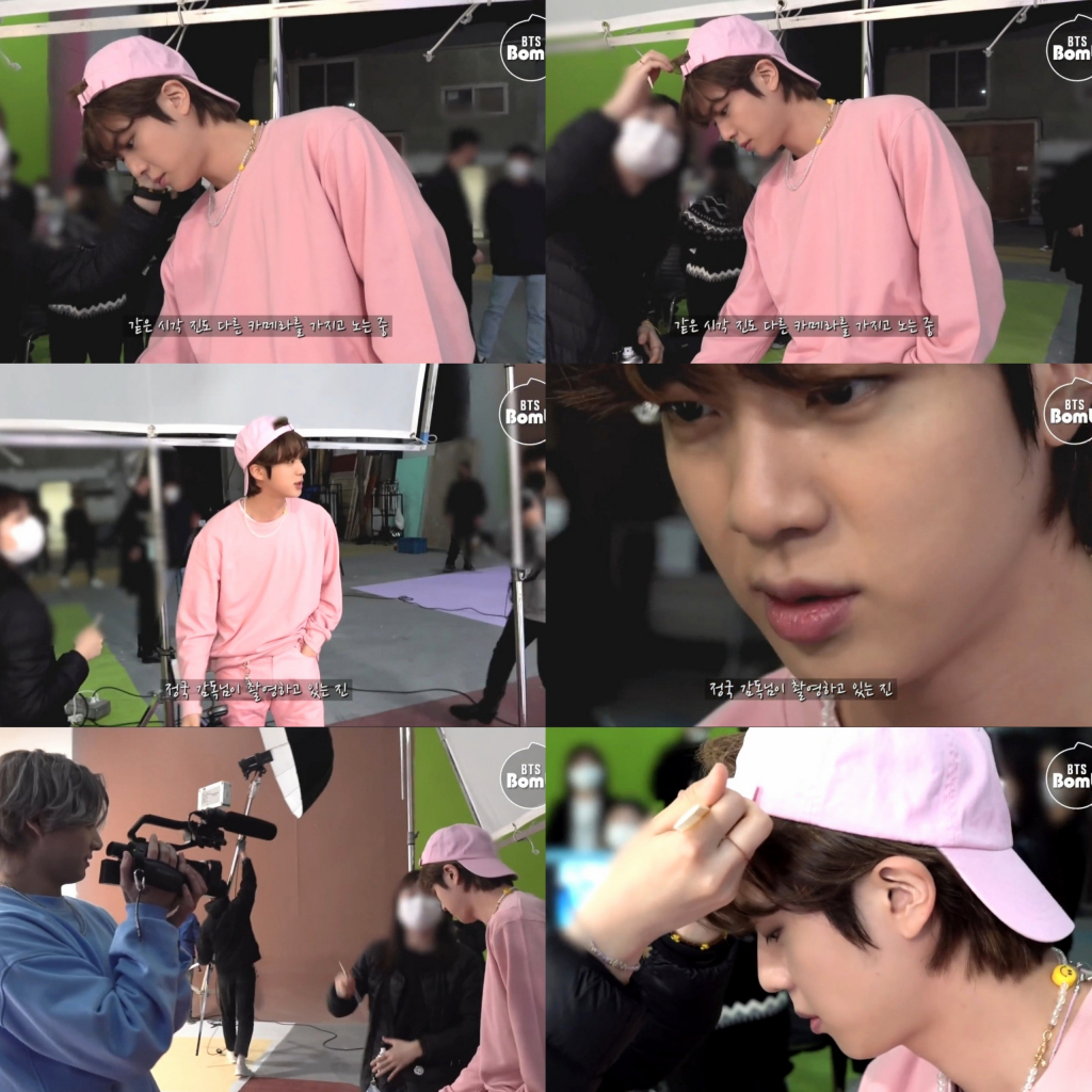 정국은 헤어 메이크업을 받고 있는 중인 진을 촬영했다. 연신 진의 얼굴을 클로즈업해 밀착 촬영하기도 했다.