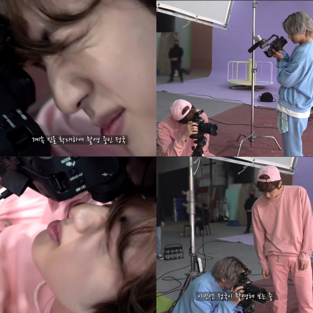 이에 정국이 진이 촬영하던 카메라로 다가갔고, 진은 정국이 앉아있는 상태로 들고 있는 카메라 가까이 키를 낮춰 얼굴을 갖다댔다. 흡사 카메라가 신기해서 다가간 깜찍한 햄스터 같은 모습이었다.