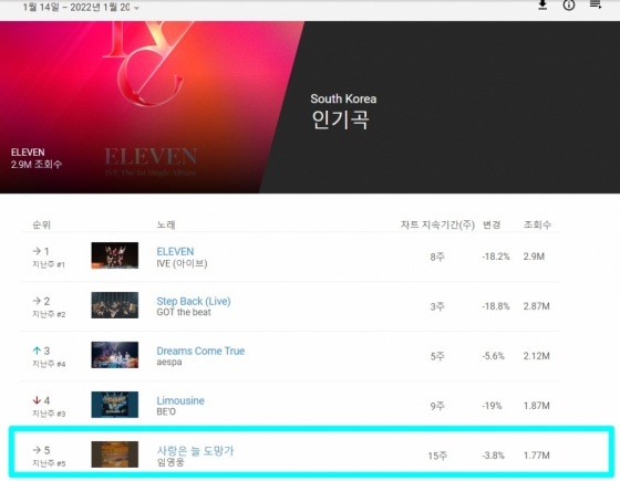 가수 임영웅의 '사랑은 늘 도망가'가 유튜브 인기곡 톱5를 이어가며 인기를 빛냈다.