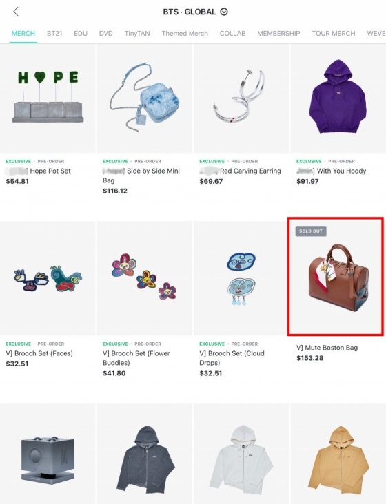 뷔가 직접 디자인 한 가방은 이 날 공개된 제품 중 가장 고가의 제품이었음에도 불구 글로벌 위버스샵에서 제일 먼저 품절을 기록하며 'Sold out king'의 명성을 입증했다.