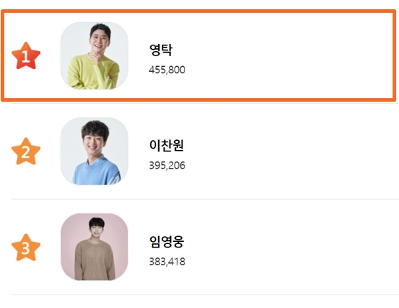 가수 영탁이 스타랭킹 스타트롯 남자 랭킹에서 처음으로 1위에 등극했다.