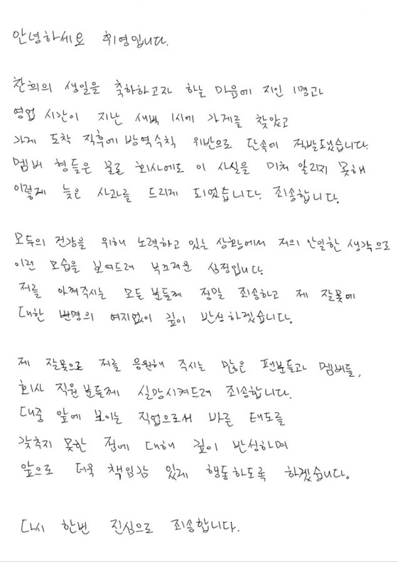 방역수칙을 위반하고 심야 생일파티를 즐겨 경찰에 입건된 그룹 SF9 휘영과 찬희가 자필 편지로 사과했다.