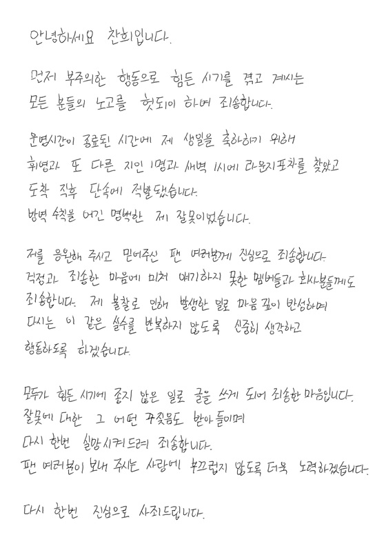 모두가 힘든 시기에 좋지 않은 일로 글을 쓰게 되어 죄송한 마음입니다. 잘못에 대한 그 어떤 꾸짖음도 받아들이며, 다시 한번 실망시켜드려 죄송합니다. 팬 여러분들이 보내 주시는 사랑에 부끄럽지 않도록 더욱 노력하겠습니다.