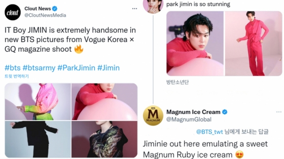 이에 해외매체 'Clout News'는 'IT Boy JIMIN의 보그 코리아 × GQ 매거진 새 사진도 굉장히 잘생겼다'고 극찬했으며, 지난해부터 꾸준히 지민에게 애정공세를 이어온 아이스크림 브랜드 매그넘(Magnum)도 지민 앓이에 동참했다.