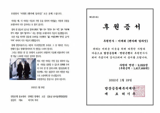 딜라잇 운영진은 "코로나19 장기화로 기부가 줄어든다는 소식을 듣고 안타까움을 느껴 올해는 상황이 나아지기를 바라는 마음을 담아 연탄 2022장을 기부했다"며 "앞으로도 어려운 이웃을 돕는 일에 꾸준히 동참하여 긍정적인 팬문화를 만들어나갈 것"이라고 전했다.