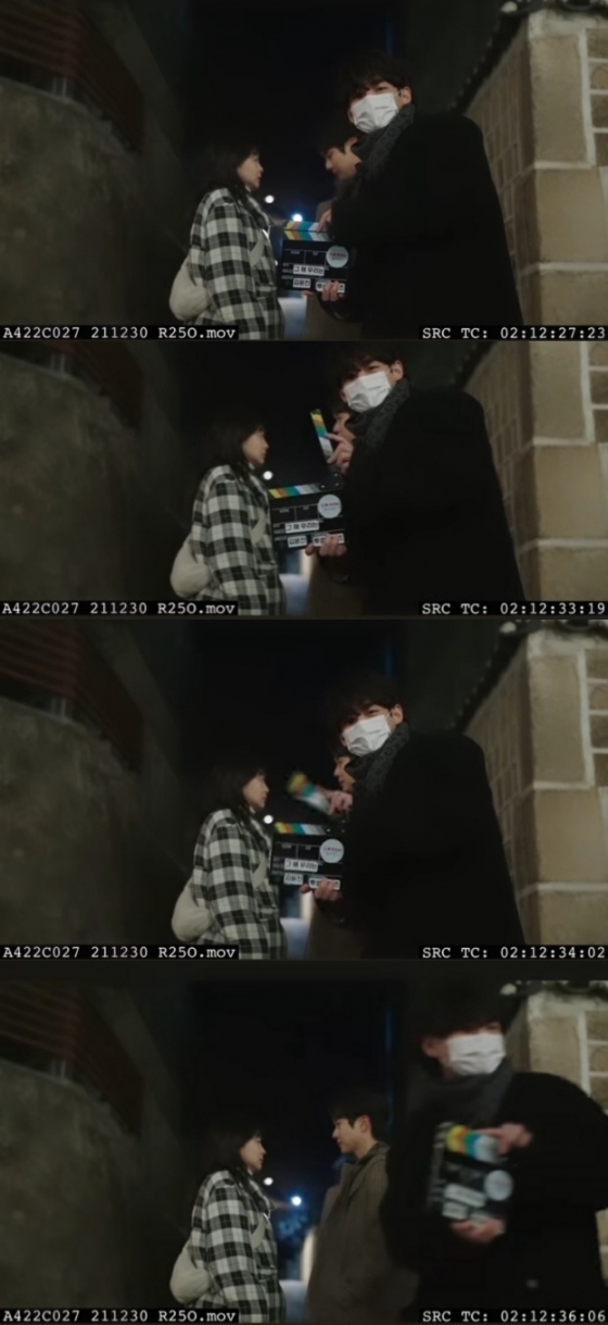 영상에는 뷔가 드라마 주인공인 최웅(최우식 분)과 국연수(김다미 분)가 골목길에서 서로의 사랑을 확인하는 달달한 씬의 촬영에 스태프로 참가해 슬레이트를 치는 모습이 담겨있다. 진지한 분위기 속의 주인공들과 달리 뷔는 즐거움과 흥분을 감추지 못한 귀여운 모습여서 팬들의 웃음을 자아냈다.