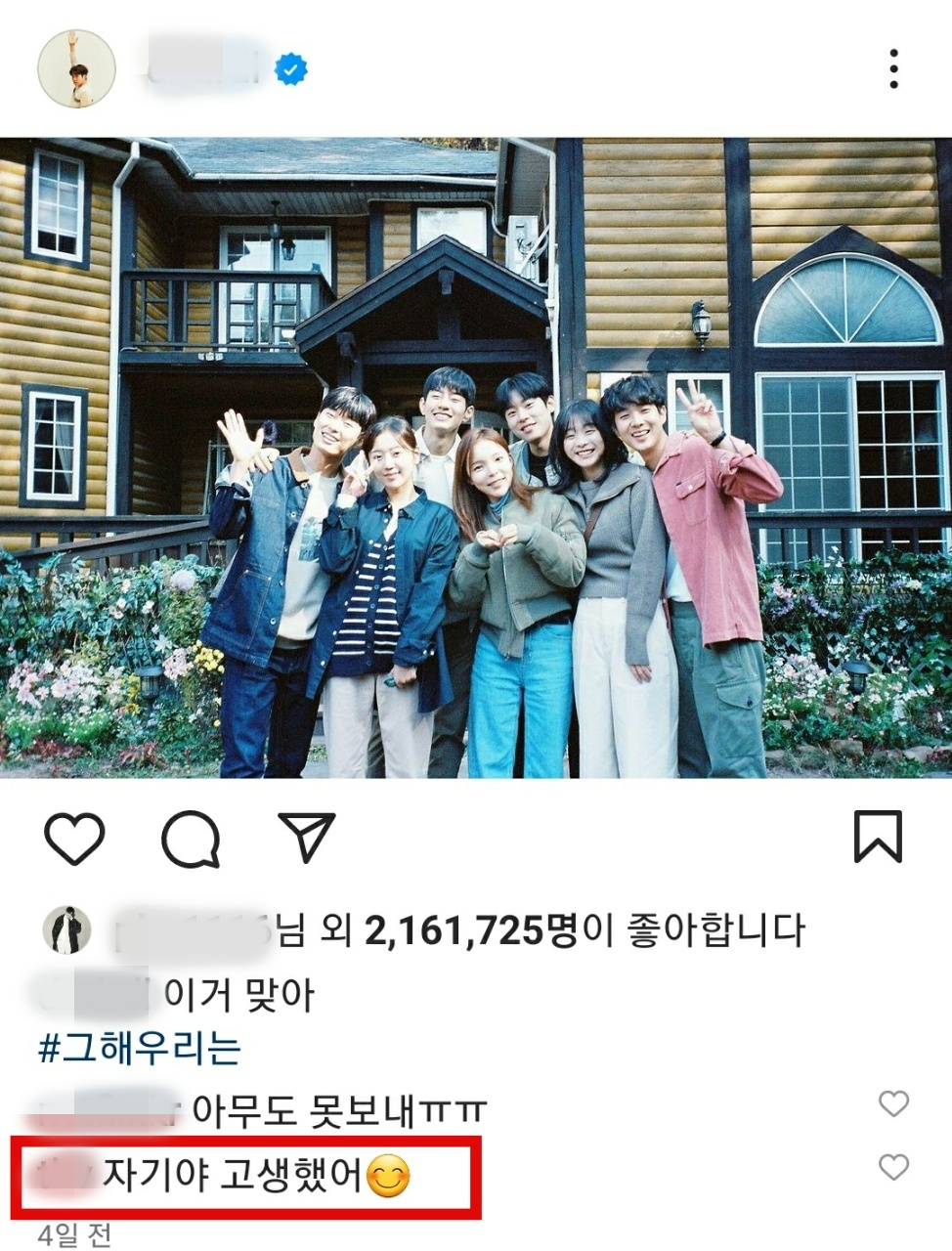 뷔는 지난 26일 최우식이 인스타그램에 게재한 '그 해 우리는'에 함께한 배우들과 찍은 사진에 다정하게 "자기야 고생했어"라고 댓글을 달아 팬들을 설레게 하기도 했다.