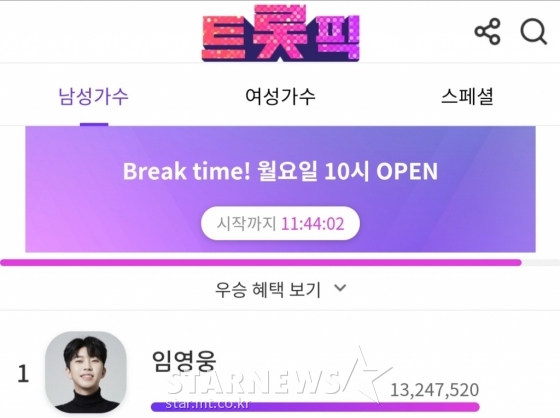 임영웅은 트로트 스타 웹서비스 트롯픽(Trotpick)에서 1월 24일부터 1월 30일까지 진행된 위클리투표에서 1324만 7520표를 기록하며 압도적인 1위를 차지했다.