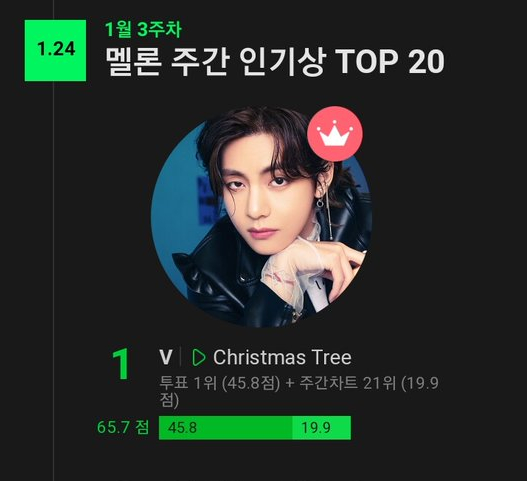 톱 아이돌그룹 방탄소년단(BTS, RM 진 지민 제이홉 슈가 뷔 정국) 멤버 뷔가 'Christmas Tree'로 멜론 주간 인기상 1위를 차지하며 'OST 킹'의 위엄을 과시했다.
