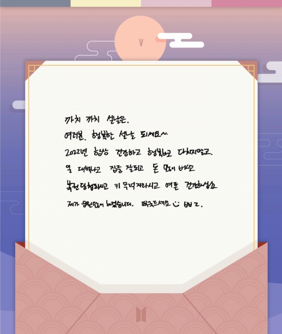 한편 지난 1월 31일 방탄소년단 멤버들은 설 연휴를 맞아 팬 커뮤니티 '위버스'를 통해 손수 쓴 설날 메세지를 전했다.