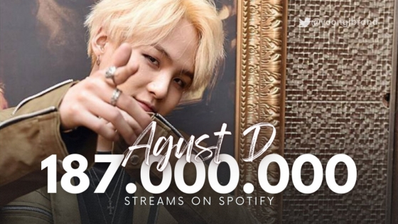 방탄소년단(BTS) 슈가의 어거스트 디(Agust D) 첫 믹스테이프 'Agust D'가 스포티파이(Spotify)에서 1억 8700만 스트리밍을 달성하며 인기를 입증했다.