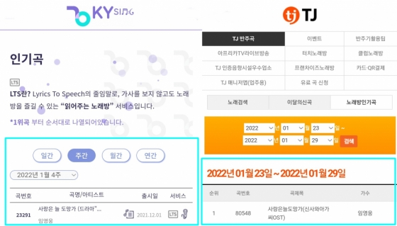 가수 임영웅의 '사랑은 늘 도망가'가 임인년(壬寅年) 새해에도 노래방 차트 주간 1위를 이어가며 빛나는 인기를 보여줬다.