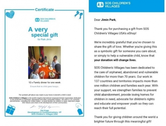 이후로도 지민에 대한 고마움을 잊지 않고 현재는 고인이 된 아버지의 생일을 축하하기 위해 최근 지민의 이름으로 어린이 전문 복지재단 '국제 SOS 어린이마을'의 '건강한 가족 만찬'에 일주일 동안 최대 120명의 아이들을 먹일 수 있는 기부 선행을 펼치고 있다.