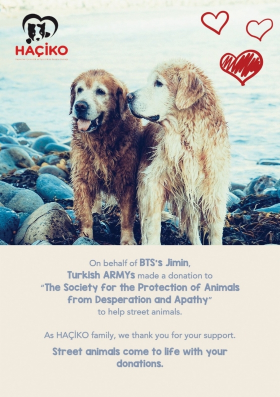 더불어 지민의 터키 팬들은 동물에 대한 지민의 사랑에 영감을 받아 동물 복지, 특히 거리의 동물들을 돕기 위해 지민의 빠른 쾌유를 비는 해시태그 #GetWellSoonJimin와 함께 지민의 이름으로 진행된 기부 선행 소식을 알렸다.