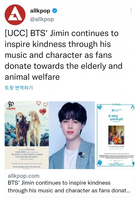 방탄소년단(BTS) 지민에게 받은 감사의 마음을 되돌려주는 팬 기부가 이어지며 선행의 모범적 선순환을 보여줘 감동을 안긴다.