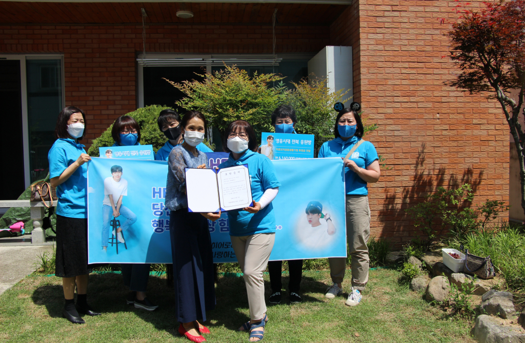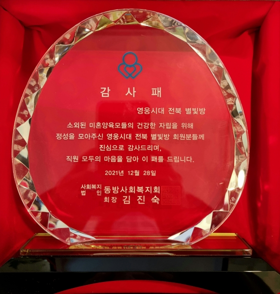 동방사회복지회 김진숙 회장은 "소외된 미혼양육모들의 건강한 자립을 위해 정성을 모은 영웅시대 전북별빛방 회원들께 전 직원이 감사한 마음을 담아 감사패를 전하게 됐다"고 말했다.